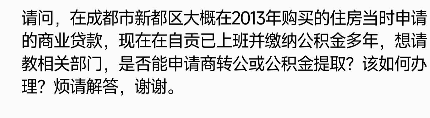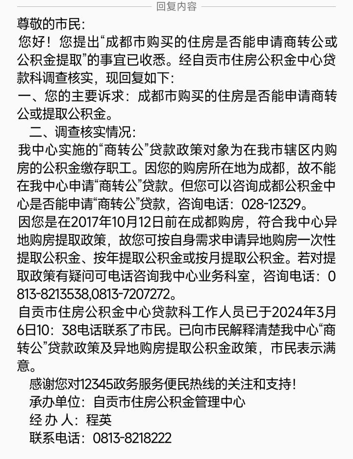 [盐都杂谈] 在成都商贷买住房,现在自贡上班并缴纳公积金,是否能申请商转公?官方回复——