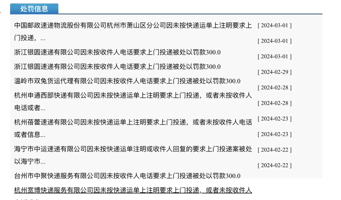 记者查阅国家邮政局执法信息公开网站发现,目前在新规后尚没有处罚案例,不过在3月1日及以前,有多家快递公司因为不上门配送被投诉后罚款300元。据了解,国家邮政局对于投诉的处理周期通常为一周内,如果真有因新规而产生的投诉和处罚情况,或许还需要一定的时间才能被公示。