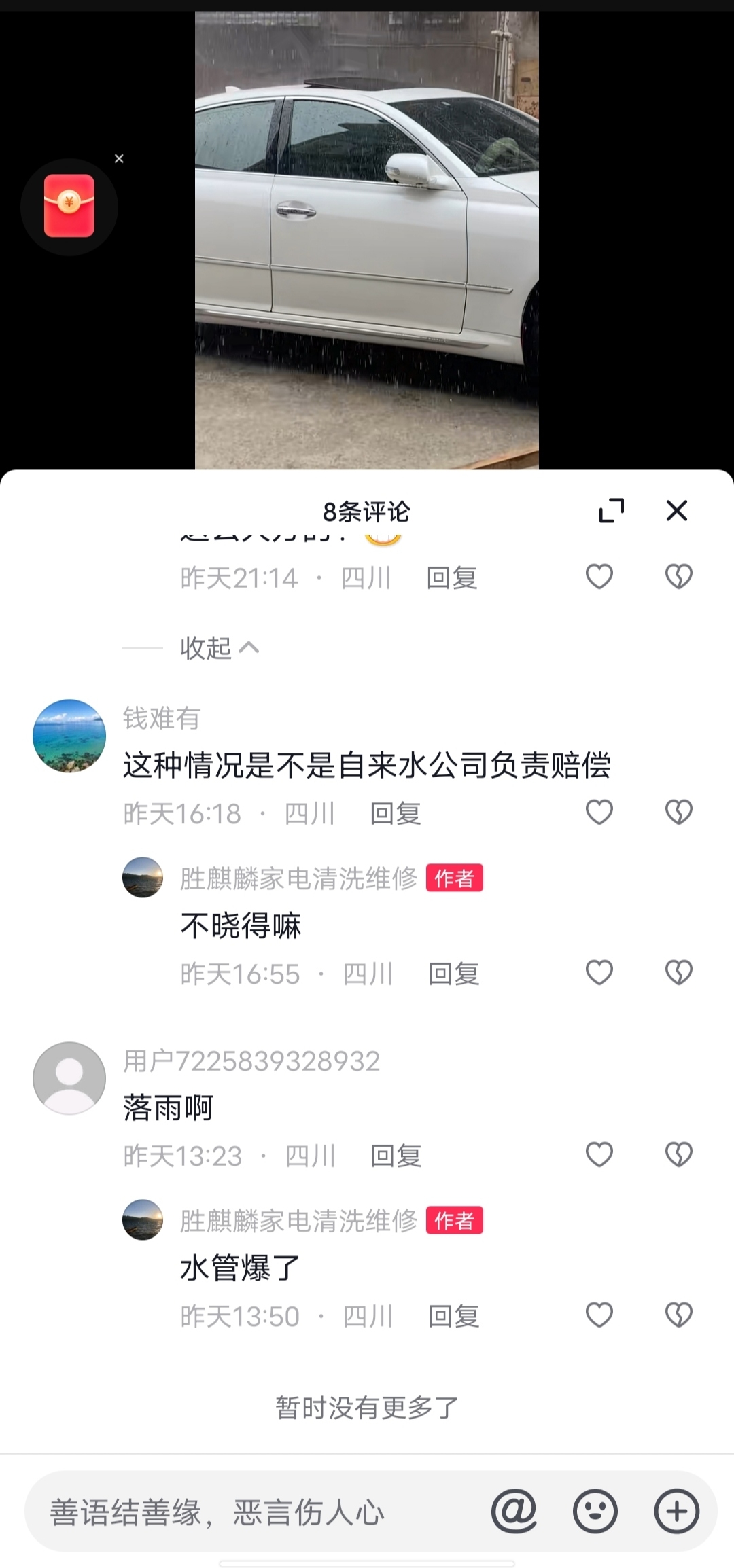 正好车窗没关严实,正好遇到水管爆了,车子还正好停在那里