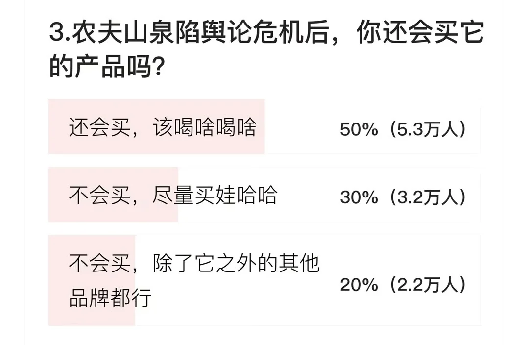 至于农夫山泉陷舆论危机后,你还会买它的产品吗?50%网友表示还会买,该喝啥喝啥,30%网友表示不会买,尽量买娃哈哈,剩下20%网友则表示除了它之外的其他品牌都行。