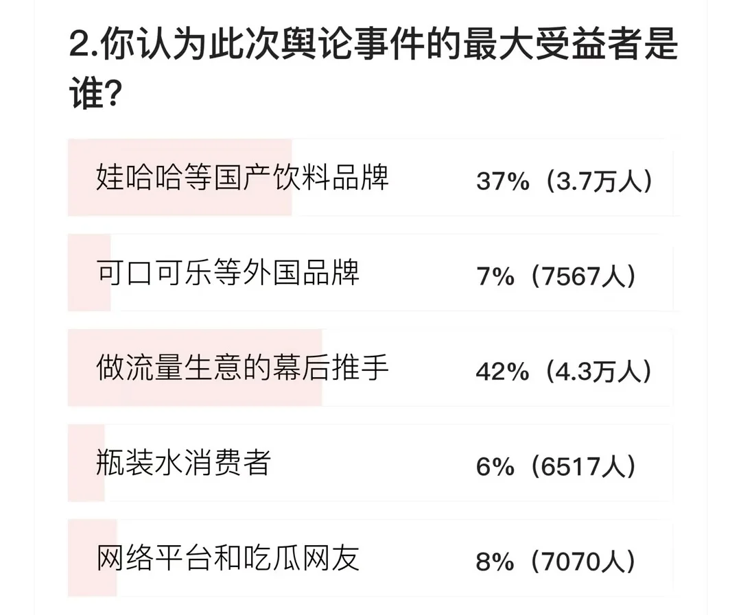对于此次舆论事件的最大受益者是谁,42%网友认为是做流量生意的幕后推手,37%网友认为是娃哈哈等国产饮料品牌,8%网友认为是网络平台和吃瓜网友,7%网友认为是可口可乐等外国品牌,6%网友认为是瓶装水消费者。