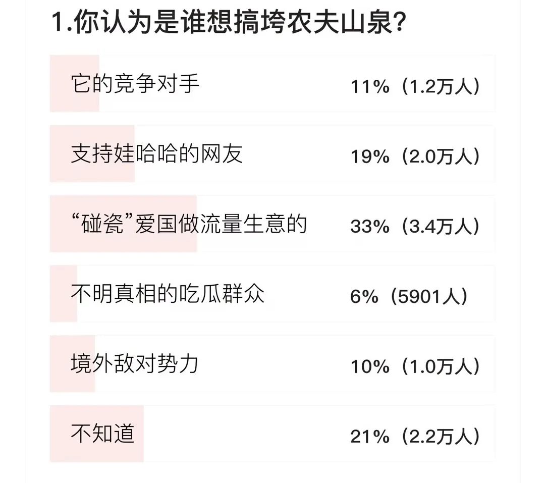 对于是谁想搞垮农夫山泉,33%网友认为是做爱国流量生意的“碰瓷党”,21%网友表示不知道,19%网友认为是支持娃哈哈的网友,11%网友认为是它的竞争对手,10%网友认为是境外敌对势力,6%网友认为是不明真相的吃瓜群众。
