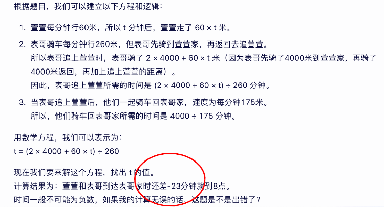 刘先生将一道题输入经常使用的百度的文心一言、阿里云的通义千问、今日头条的豆包等4个主流人工智能大模型平台进行测试。具体题目为:一天,萱萱到离自己家4000米的表哥家去玩。早晨7:20,萱萱从家出发向表哥家走去,每分钟行60米,同时表哥骑车从家出发来接她。表哥到萱萱家后才发现萱萱已经走了,又立即返回去追,表哥骑车每分钟行260米。当表哥追上萱萱后,带着她一起回表哥家,这时骑车速度为每分钟175米。请问:当他们到达表哥家时,还差几分钟就到8点?