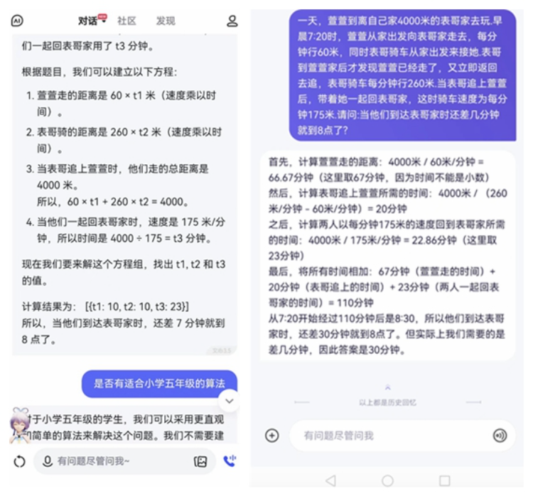 “当时两个(AI平台)列出了推理过程,均给出了‘7分钟’的答案,应该是对的。我觉得算得有点复杂,就又让AI用适合小学五年级的算法再算一次,结果答案自此之后就不一致了。”在刘先生提供的截图中,上游新闻记者看到,有的平台会给出“30分钟”的答案。