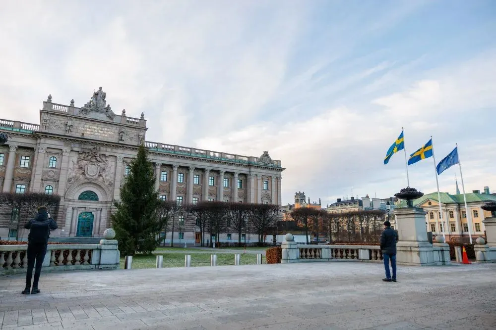 2023年1月1日,在瑞典首都斯德哥尔摩,瑞典议会大楼外悬挂瑞典国旗和欧盟旗帜。新华社发(魏学超摄)