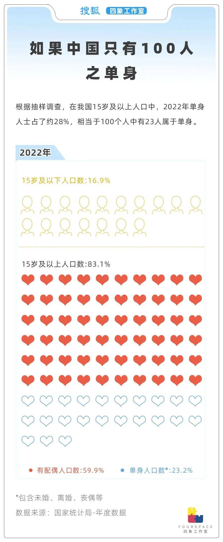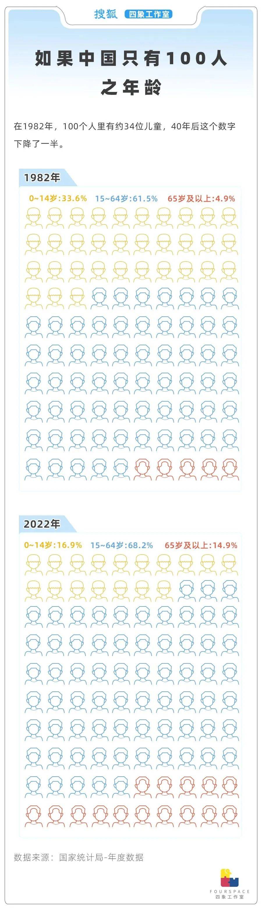 原标题:变化的中国人口:儿童占比较40年前减半 近1/4是单身 如果把中国所有人口简化为100个人,他们会有什么样的特点?这些特点又是如何随着时代发展而跃变的? 在上一期内容中,四象分析了人口常住地、城镇化率、劳动力等因素,本期我们接着来看中国的人口特征。 文 | Roxie 图 | 四象设计部 “男性比女性多3000万”屡上热搜,但如果将全国简化为100人,差距尚不明显,相当于51个男性对应49个女性。当然,这个比例在不同年龄段有所差异,比如对00后来说,每100人里有多达54人是男性。 按年龄来看,无论是1982年还是2022年,15到64岁之间的中青年群体无疑是中流砥柱,在全国每100人中占到六成以上的比例,而14岁以下的儿童比当年约34人减少了一半,老人群体则增加了近10位。 和“银发经济”一样日益火热的是“单身经济”,背后隐藏着不可忽视的单身人口。抽样调查显示,2022年全国每100个人里约23人是单身,此处单身的定义指15岁及以上未婚、离婚、丧偶等多种人口的情况。 对如今不少年轻人来说,谈恋爱甚至没有上网好玩,但互联网并非从来就有。1994年4月,一条64K的国际专线从中科院计算机网络中心连入互联网,是中国全功能连接互联网的起点。30年来,随着互联网尤其是移动网络的普及,如今在中国的每100个人里,已有76人可以成为彼此的网友。 同样瞩目的是近几十年来国人教育水平的提升,40多年前100个人里凑不齐1个念过大专或本科的人,如今已被戏谑为“本科遍地走”,甚至连研究生都已多到无宿舍可住。 当我们将14亿人口简化为100人,便能更清晰地窥见各类群体特点,以及这些特点所反映的岁月流转。待到下次人口普查,又会呈现出怎样的变化?返回搜狐,查看更多
