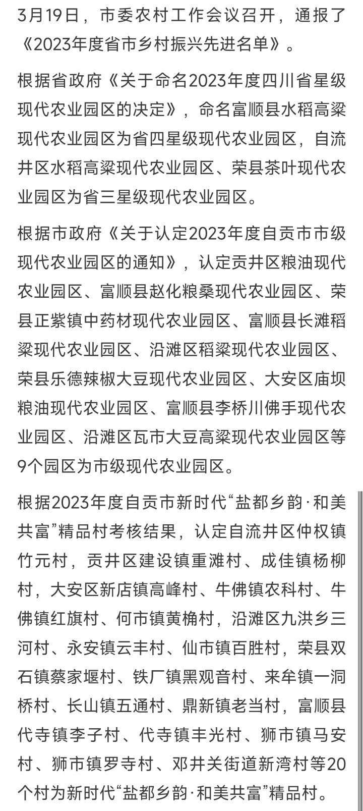 [盐都杂谈] 自贡公布2023年度省市乡村振兴先进名单