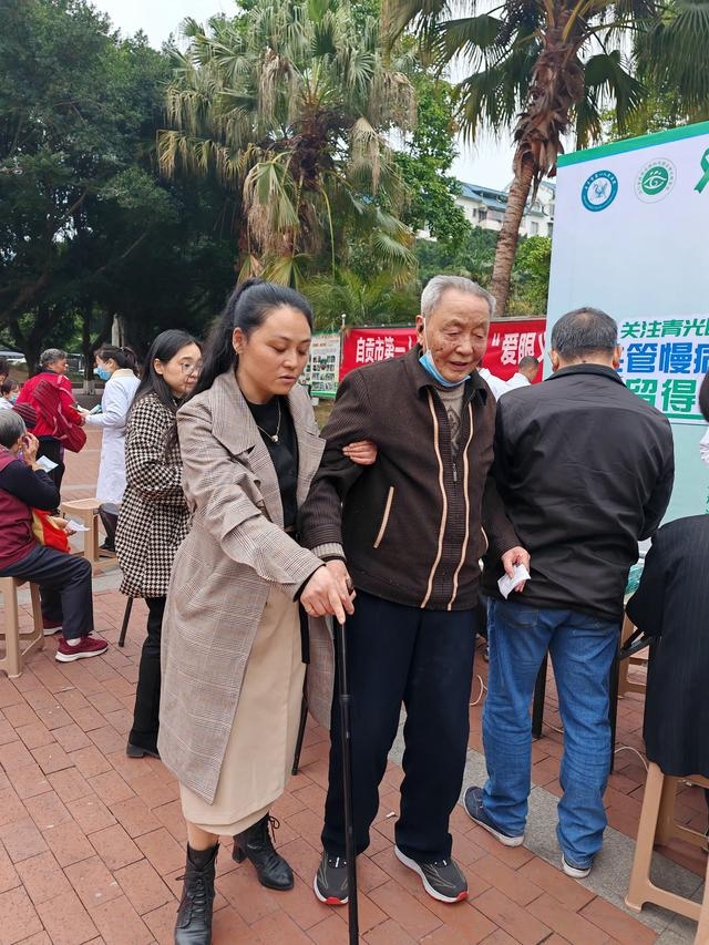 一位92岁的老人拄着拐杖前来就诊,社区书记苏 玲赶快上前搀扶。