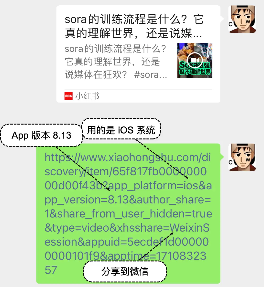 比如下图里的小红书帖子,它的链接其实两行半就够了,多出来的全是跟踪参数。
