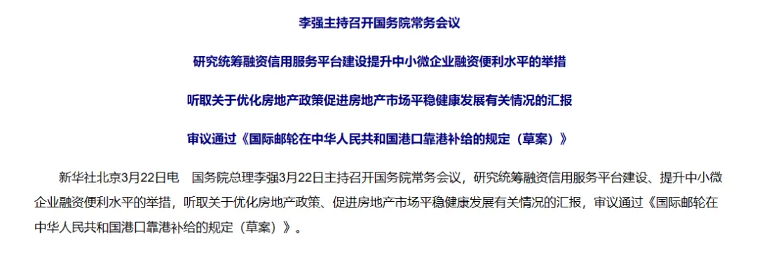 据央视新闻消息,3月22日,国务院总理李强主持召开国务院常务会议,研究统筹融资信用服务平台建设、提升中小微企业融资便利水平的举措,听取关于优化房地产政策、促进房地产市场平稳健康发展有关情况的汇报。