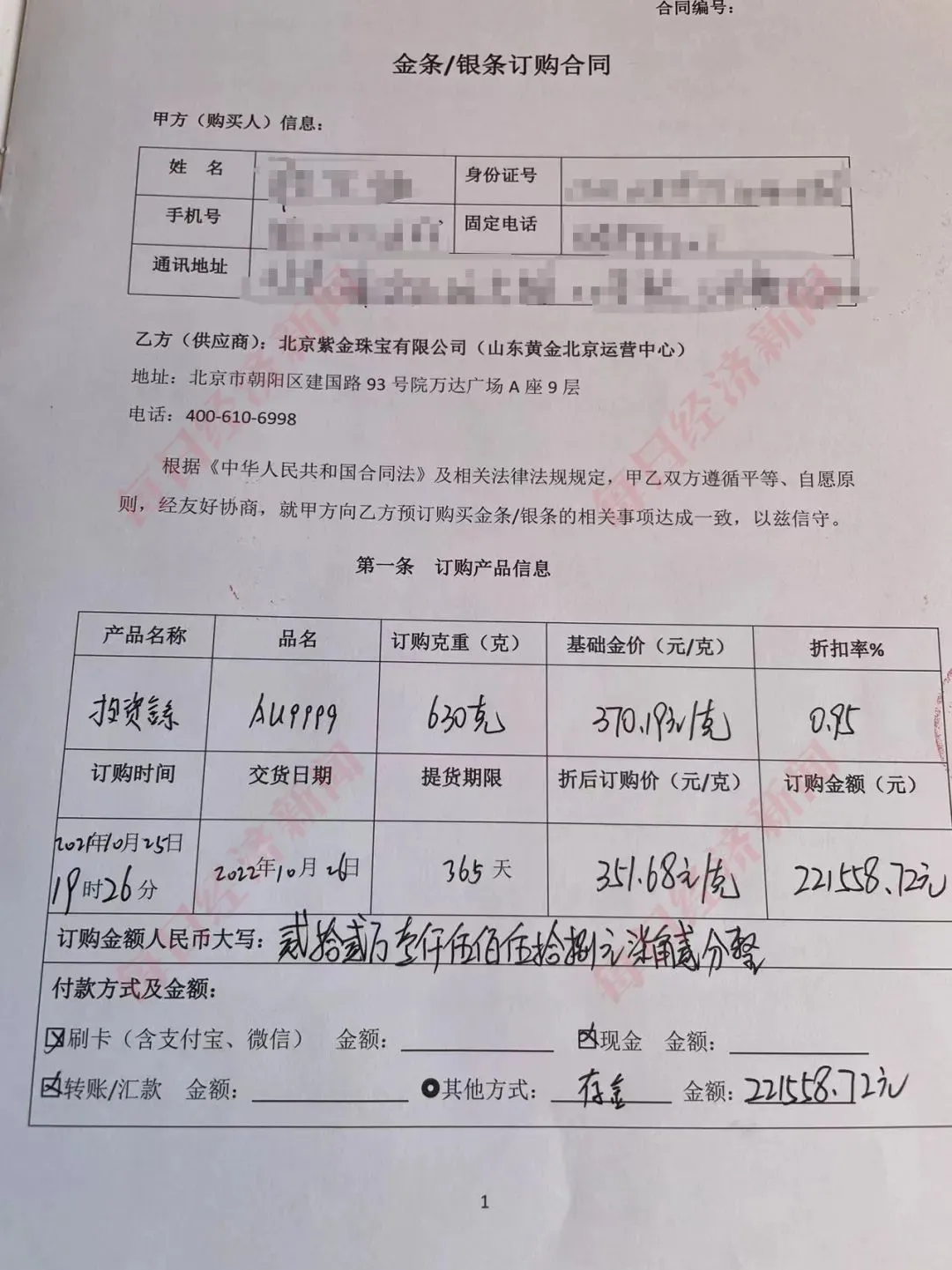 朱女士的投资金条提货期限为365天,订购日期为2021年10月25日,交货日期为2022年10月26日。虽然朱女士提供的合同左上角印有“山东黄金北京运营中心”的字样,但实际乙方印章为“北京紫金珠宝有限公司合同专用章”,乙方经办信息处印章为“北京紫金珠宝有限公司收款专用章”,收银盖章处为“山东黄金金源贵友店”。