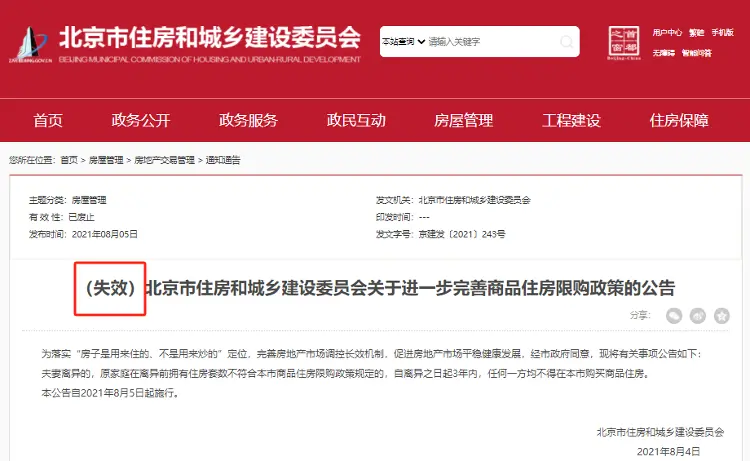 据北京市住房和城乡建设委员会官网显示,一则名为《北京市住房和城乡建设委员会关于进一步完善商品住房限购政策的公告》(以下简称《公告》)已处于失效状态。记者了解到,该《公告》自2021年8月5日起施行。其内容为:夫妻离异的,原家庭在离异前拥有住房套数不符合本市商品住房限购政策规定的,自离异之日起3年内,任何一方均不得在本市购买商品住房。