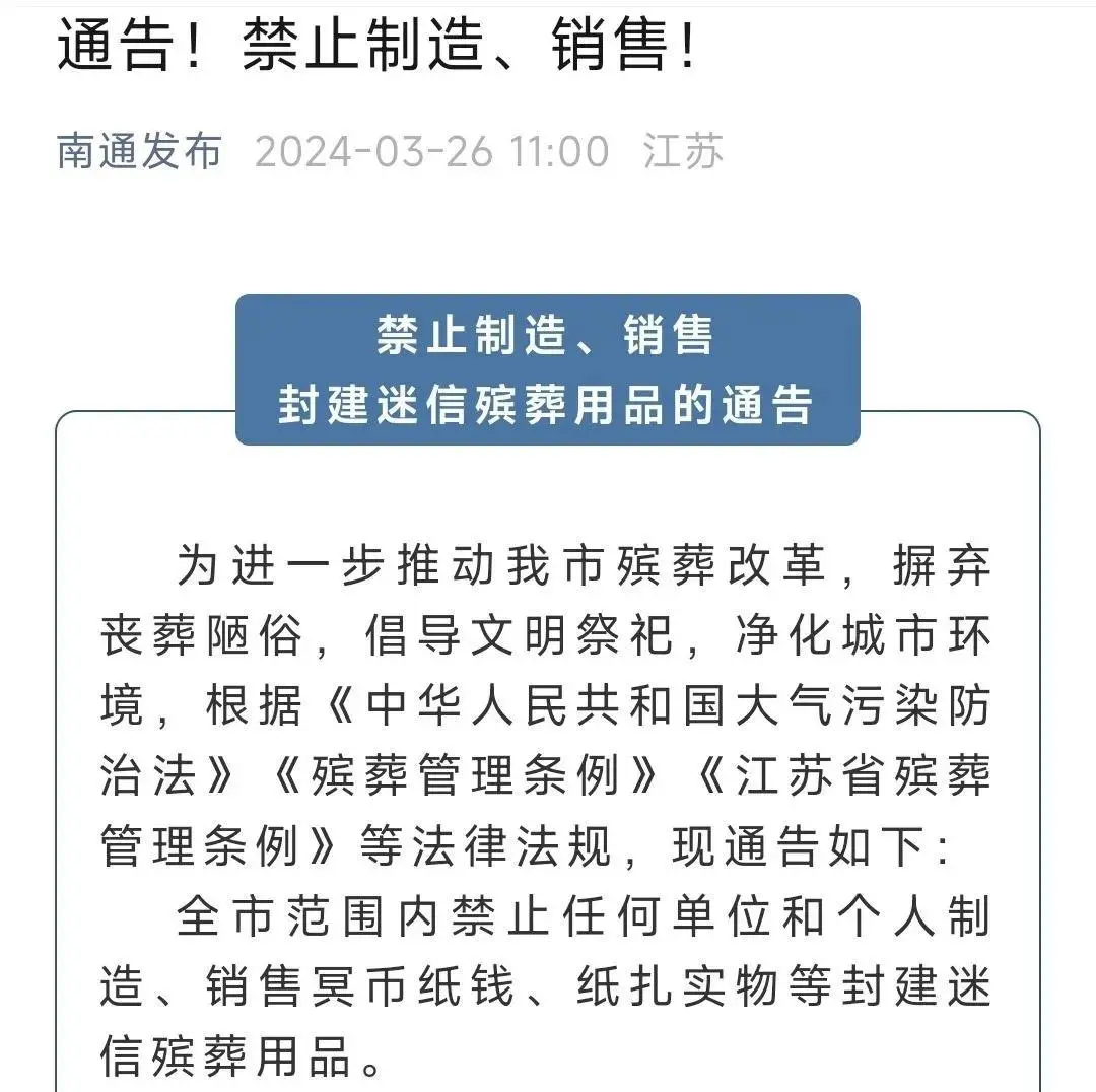 据南通发布消息,3月25日,南通民政局称,将在全市范围内禁止任何单位和个人制造、销售冥币纸钱、纸扎实物等封建迷信殡葬用品,并表示,这样做的目的是为进一步推动市区殡葬改革,摒弃丧葬陋俗,倡导文明祭祀,净化城市环境。