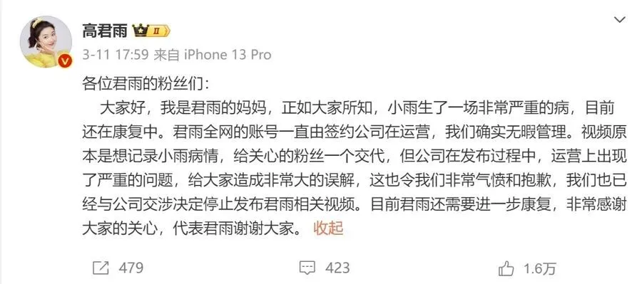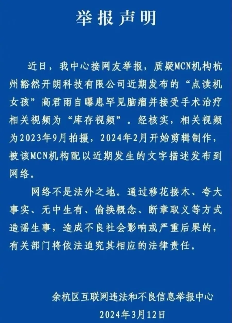 舆论压力下,高君雨母亲通过高君雨官方微博表示,相关内容由签约的MCN公司发布,对造成的误解向公众道歉。余杭区互联网违法和不良信息举报中心则发布举报声明称,经核实,相关视频由MCN机构杭州豁然开朗科技有限公司发布,实为2023年9月拍摄、2024年2月开始剪辑制作。