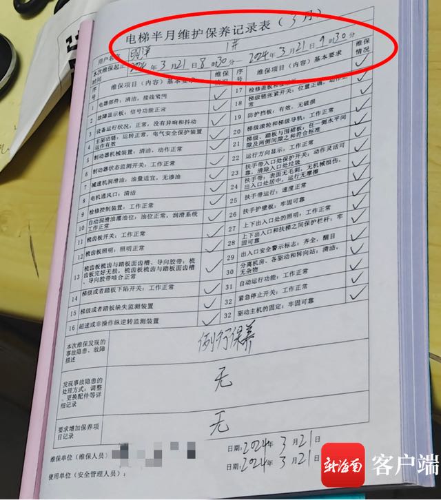 不过,记者在现场电梯维护保养记录表上看到,电梯半月维护保养记录显示,3月21日早上8点30至9点30日之间有过维保记录,记录显示未发现事故隐患和故障,表中32项维保项目(内容)全部正常。
