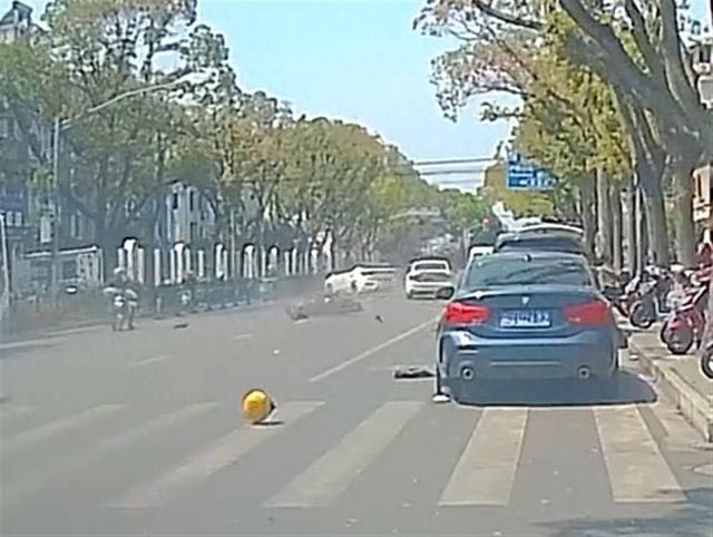 一段事发时的行车记录仪视频显示,在一条马路上,一辆白色轿车突然撞上一名骑电动车的外卖骑手,电动车被撞倒在路面上。外卖骑手则被撞上车顶,顶行数十米后,从车顶摔落到地面上,骑手的头盔也散落在了马路上。白色轿车则继续行驶,在追尾一辆正在行驶中的车辆后也没有停下,逐渐消失在镜头中。
