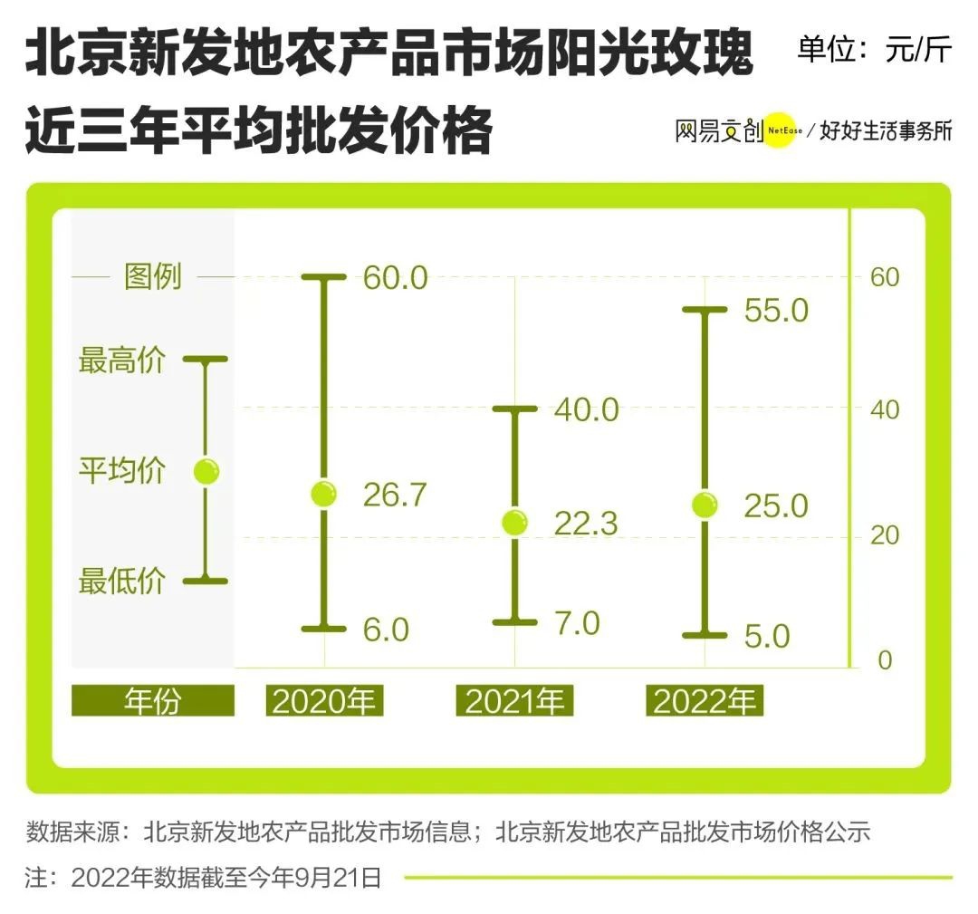 根据北京新发地农产品市场价格公示数据显示,2020年、2021年、2022年新发地的阳光玫瑰批发价分别为26.7元、22.3元、25元,和巅峰时不可同日而语。