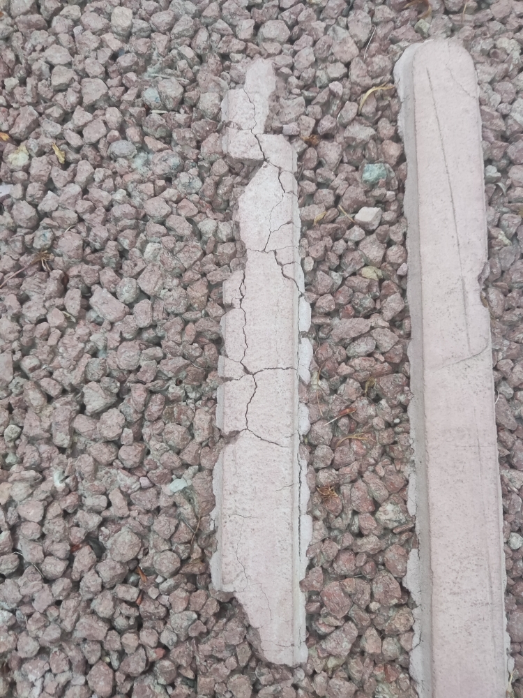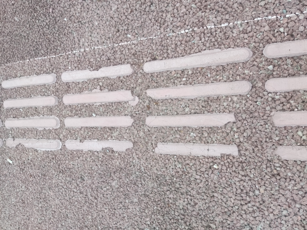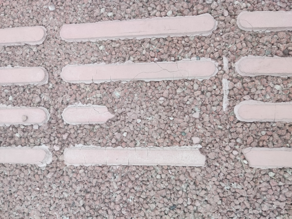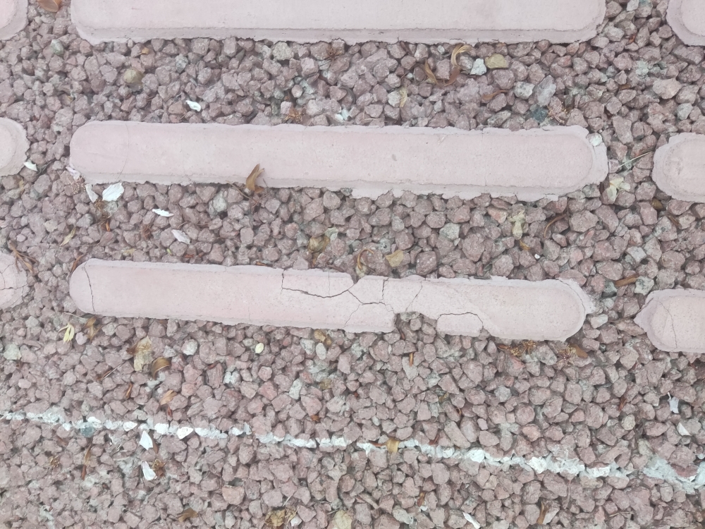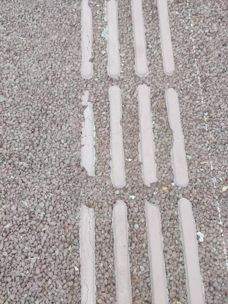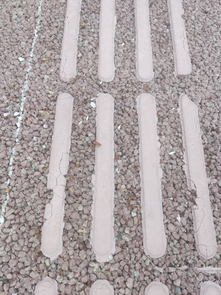 前两天见到兴川街没有盲道,这两天路过看到已经有盲道了,就是这种粘上去的那种,刚好今天往G348步行道走也见到了这样的粘贴式盲道,按道理说粘贴的话也没什么问题,踩上去也确实有那种盲道顶脚的感觉,不过仔细一看才发现这样的质量好差劲,不少的裂开了损坏了。