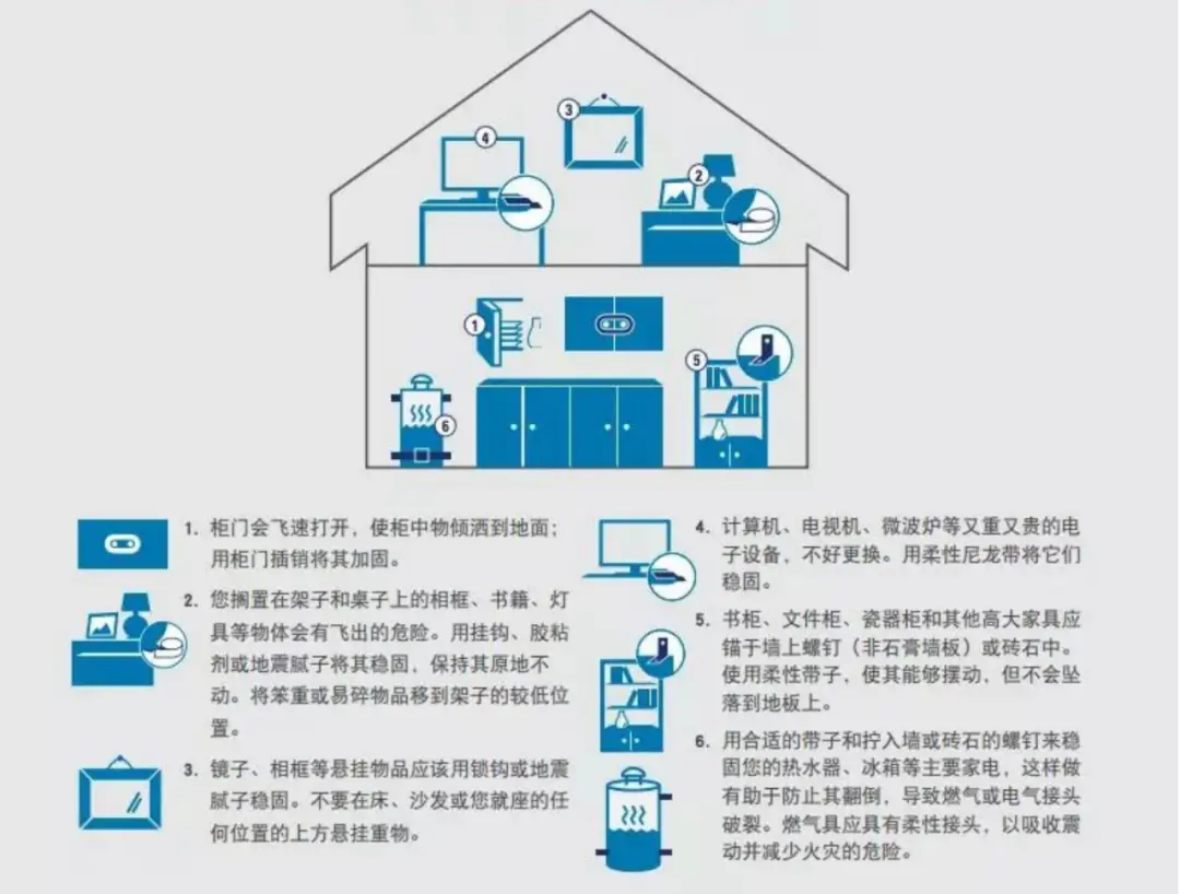 在日常生活、学习、工作中,要会识别和分析家中及办公环境的地震灾害风险隐患,尤其是那些容易倾倒的大型家具、容易砸到人的悬挂物、发生位移容易损坏的燃气管道和电线等装置以及在上班、上学途中的巨大的广告牌和玻璃幕墙。