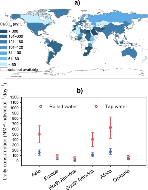 全球饮用开水和自来水的NMPs摄入量通常情况下,全球自来水中的纳米塑料浓度低于1mg/L(约每升31±2.0微粒),且大多数纳米塑料颗粒在水煮沸后都能有效沉淀下来。因此,简单的煮沸过程就能极大地补充传统的水处理方法,从而有效去除自来水中的纳米塑料颗粒,可谓是减少全球人口接触纳米塑料颗粒的行之有效的方法。然而,从全球角度看,大部分人还是习惯于喝自来水或者瓶装水,而喝开水仅仅是极少部分地区人口的地方传统,比如:中国、越南、印度尼西亚等亚洲国家。没想到,烧开水喝还真是好习惯,使该地区的人群在不知不觉中减少了微塑料的摄入量呢!因此,研究者推荐,有条件的情况下可以使用非塑料的电热水壶来烧开水,不仅耗能低,二氧化碳的排放量还比较小。同时,也可以安装一些过滤装置来辅助,但要注意保留部分水垢将有助于微塑料的沉淀。