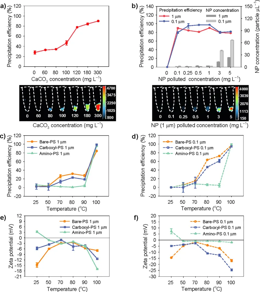 煮沸过程使得微塑料沉淀率最高达90%研究者从中国广州收集到了自来水,将其与荧光PS、氯化钙和碳酸氢钠溶液以及电阻率为18MΩ-cm的去离子水相混合和处理,紧接着模拟了含有纳米塑料(1μm和0.1μm)和微塑料(100-150μm)的自来水沸腾过程,以评估水温、水硬度、纳米塑料浓度和性质对那你塑料颗粒和水沉积物共沉淀的影响。在加热自来水的过程中,随着温度的升高(从25到90°C),上清液中纳米塑料的去除率从最初的2±0.15%逐渐增加到28±2.6%,而水煮沸时(100°C)该数值急剧升至84±1.1%。与此同时,纳米塑料浓度从每μL的30±4.0粒子降低至4.8±2.6,即纳米塑料从上清液中转移到了沉淀物里。水温升高加速了沉淀物的形成,使得沉淀物中纳米塑料浓度逐渐增加;当水温升至100°C时,沉淀物中的纳米塑料浓度达到最高。也就是说,在水煮沸的过程中,纳米微塑料能够与水中的某些化合物共沉淀,最终成为水壶中的水垢沉淀;而加热和煮沸的过程,则将有助于自来水中更多的纳米塑料颗粒沉淀。