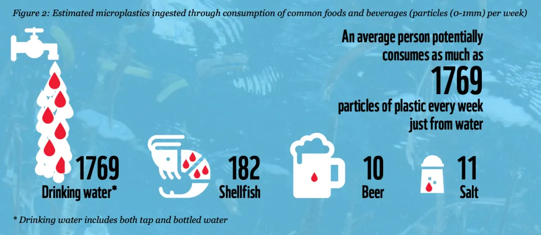 按照重量计算的话,每人每年会吃掉5万个微塑料微粒;具像化来说,大约每周能吃掉5g微塑料,相当于一张银行卡的重量!而世界自然基金会分析微塑料来源后发现,人类摄入的最主要来源竟是“饮水”(包括自来水和瓶装水)。