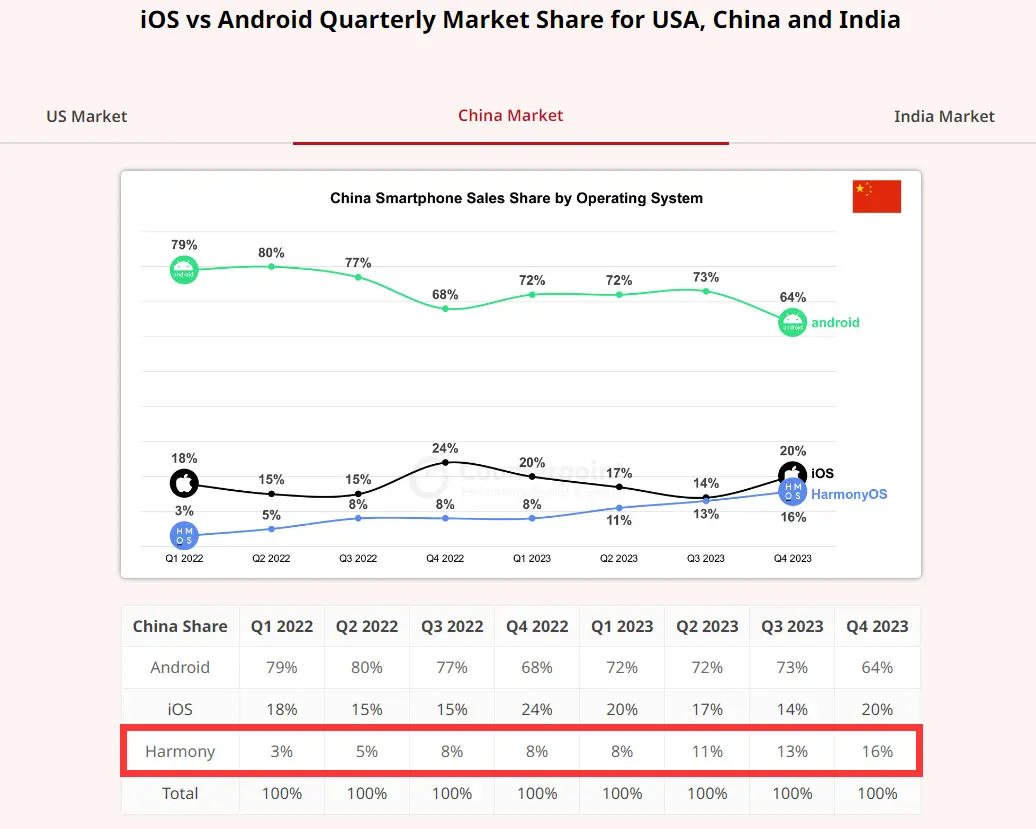 根据近期Counterpoint Research发布的数据,2023年四季度,鸿蒙OS在中国智能手机市场的份额突破了16%,相比两年前增长了13个百分点,与苹果iOS的差距缩小至4个百分点;该季度,超过40%的鸿蒙手机支持5G,而上年同期为7%。而在全球市场上,鸿蒙4%的份额,与两大传统巨头仍存在明显差距,苹果iOS的份额为 23%,安卓则为74%。