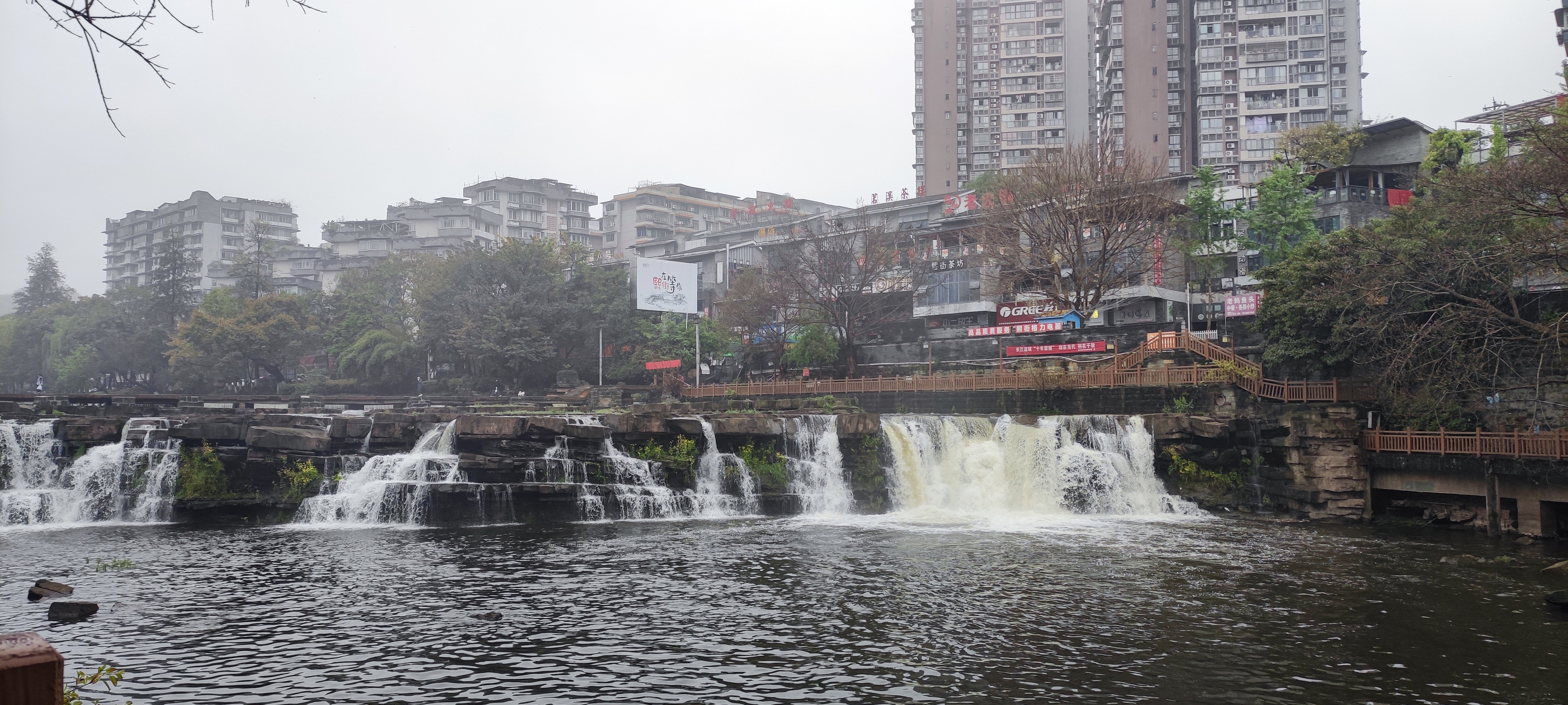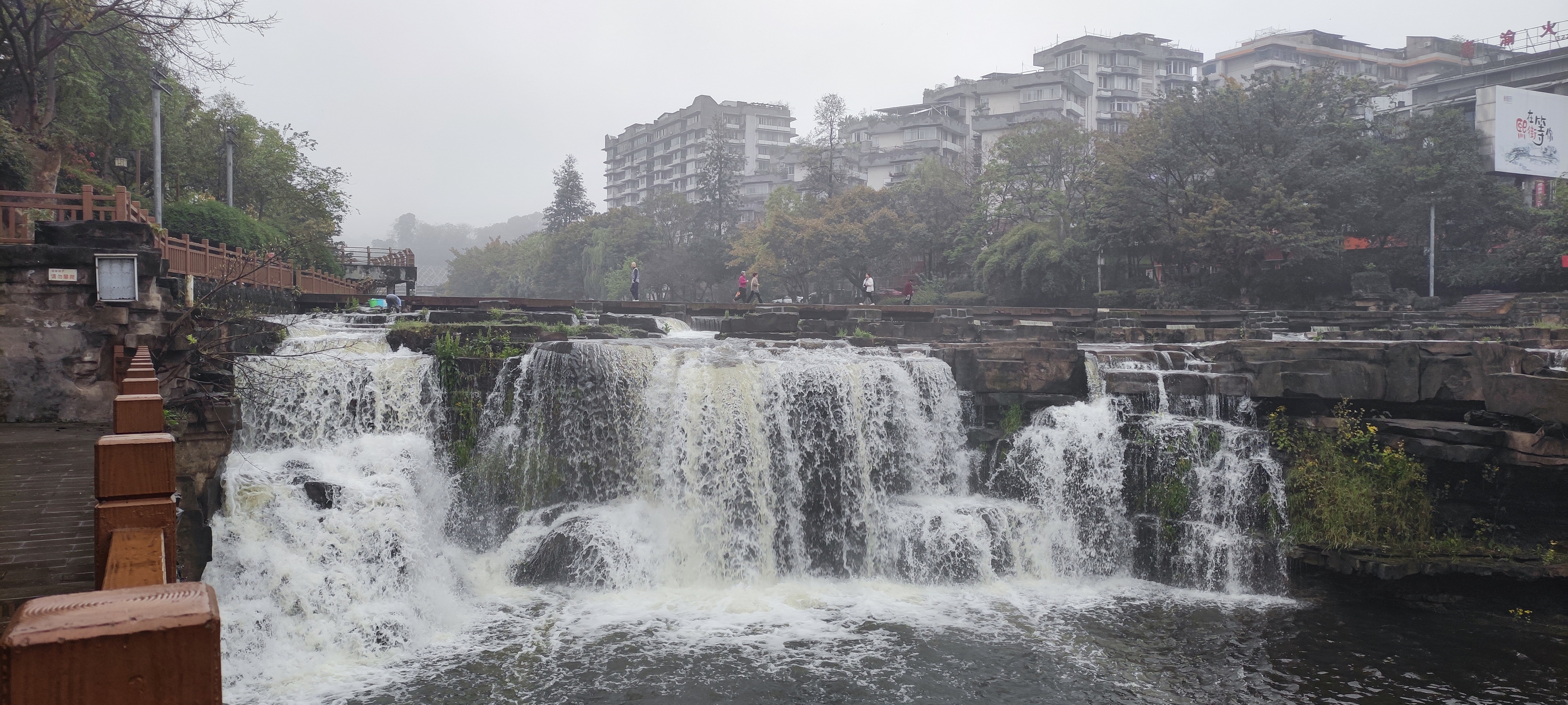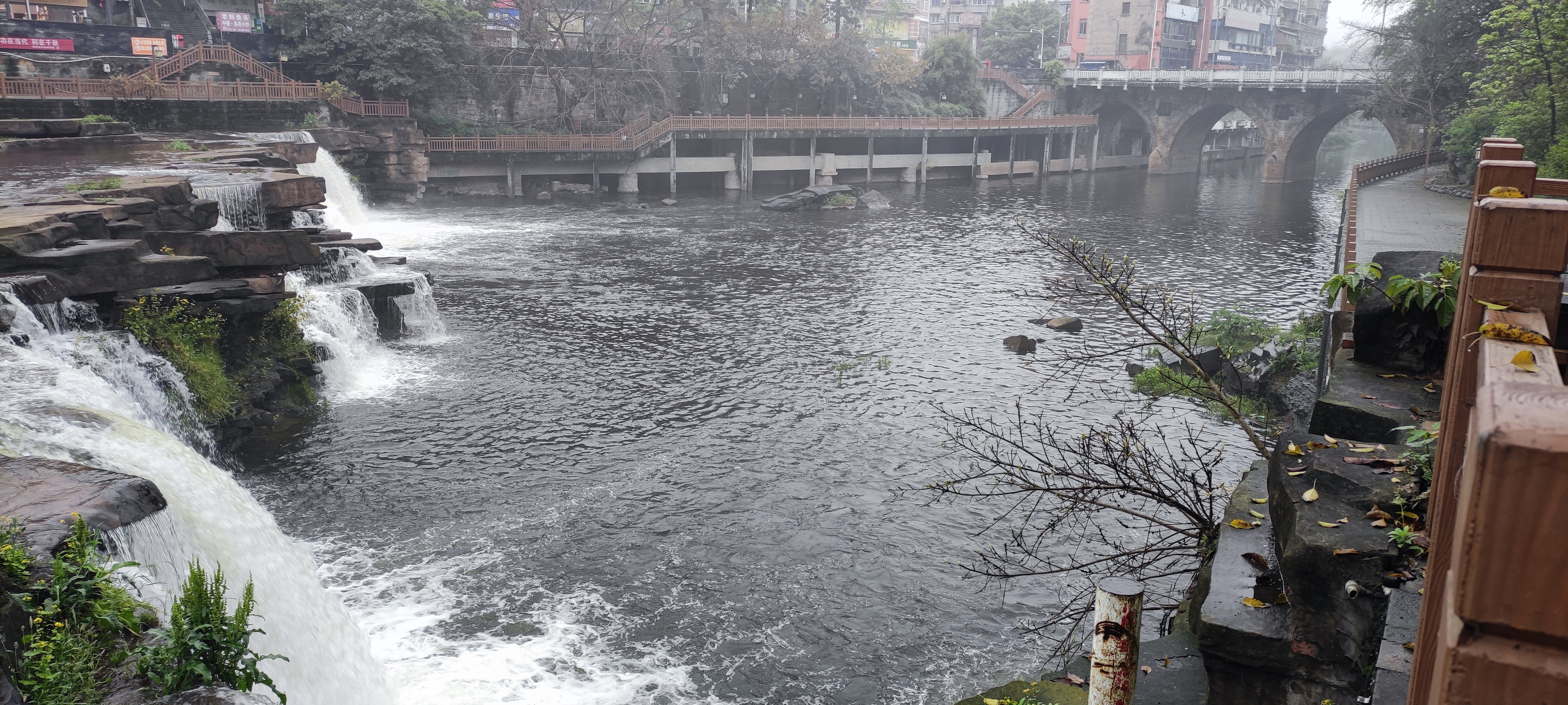注:贡井平桥瀑布,是国内少见的城中瀑布,瀑布上游是旭水河的八里秦淮。由于冬季雨水小、少,导致河床干涸,瀑布断流,除一小股瀑布外,只见瀑布处岩石突兀。