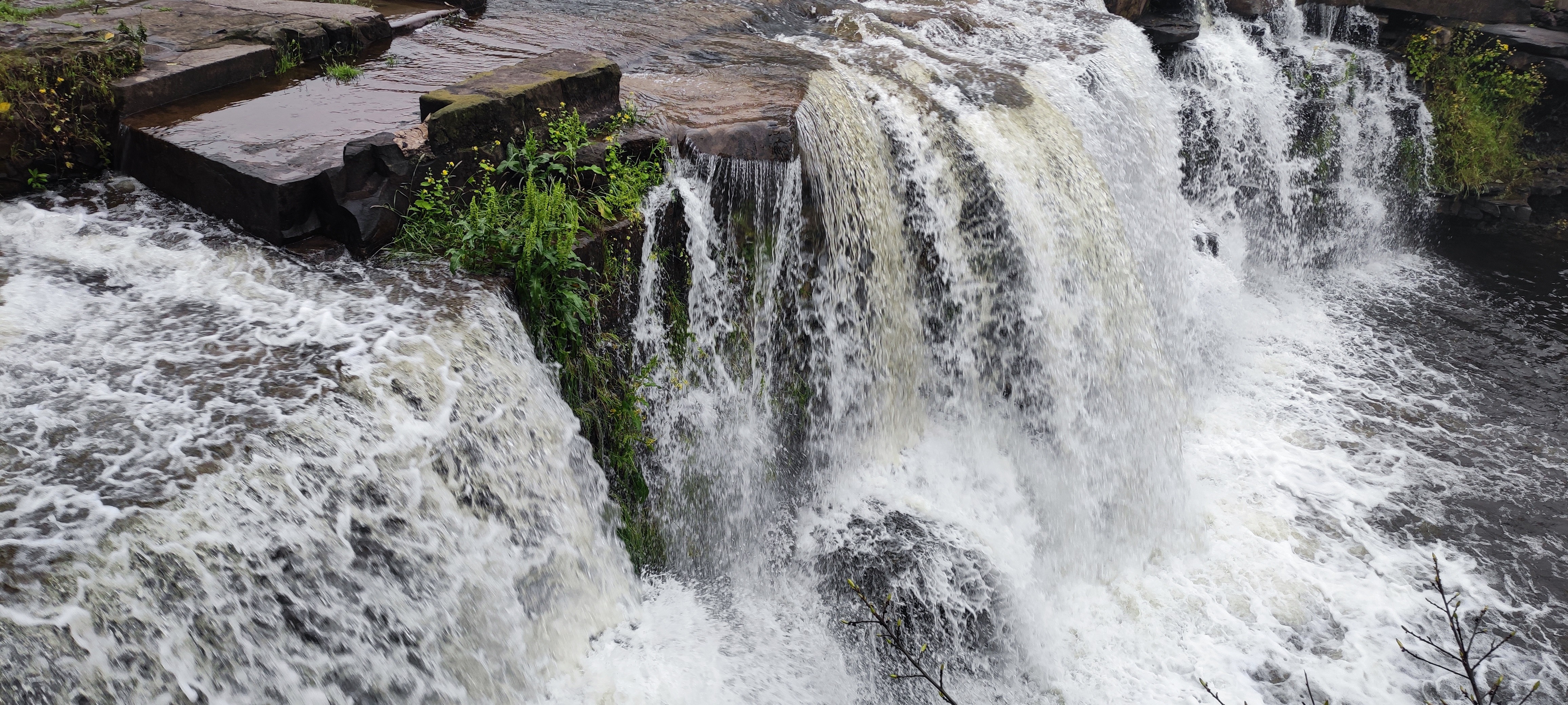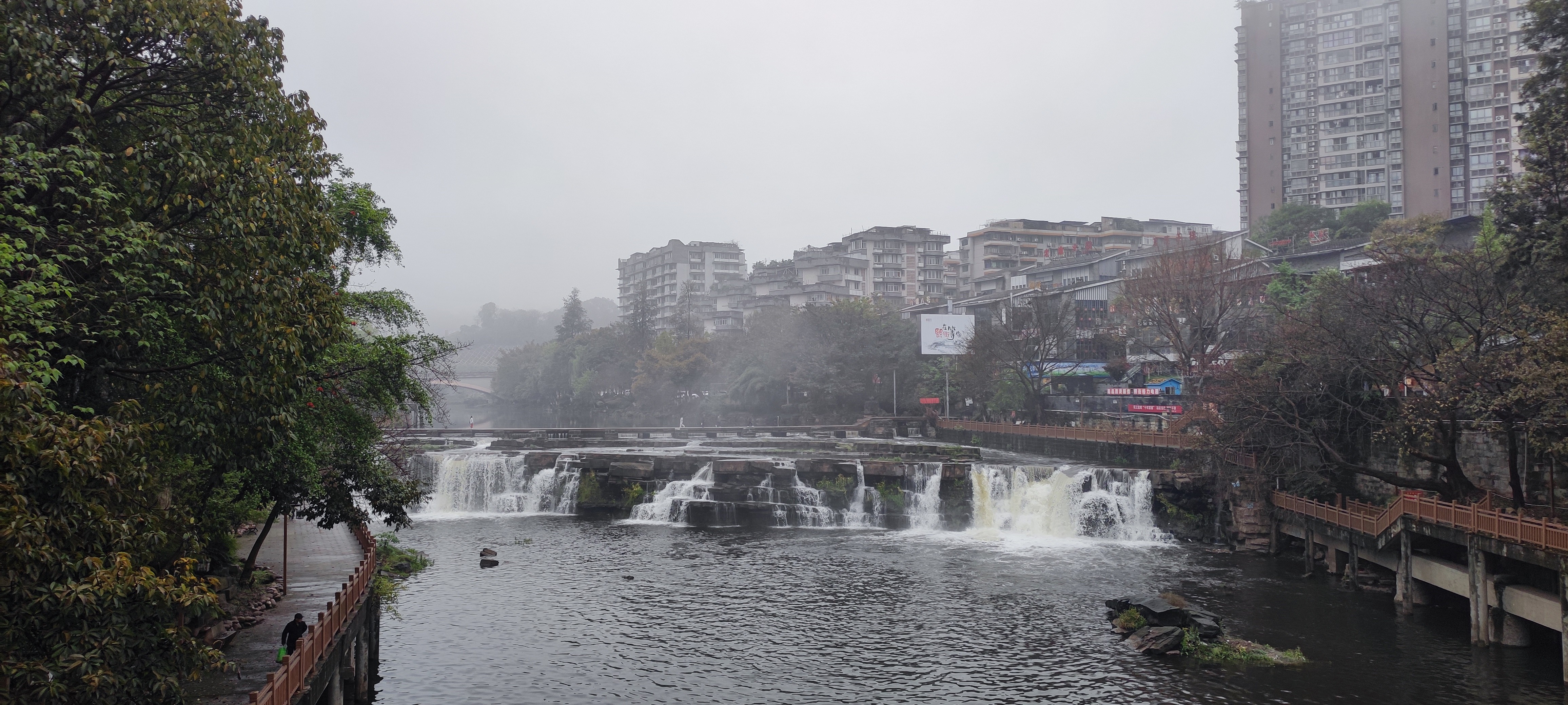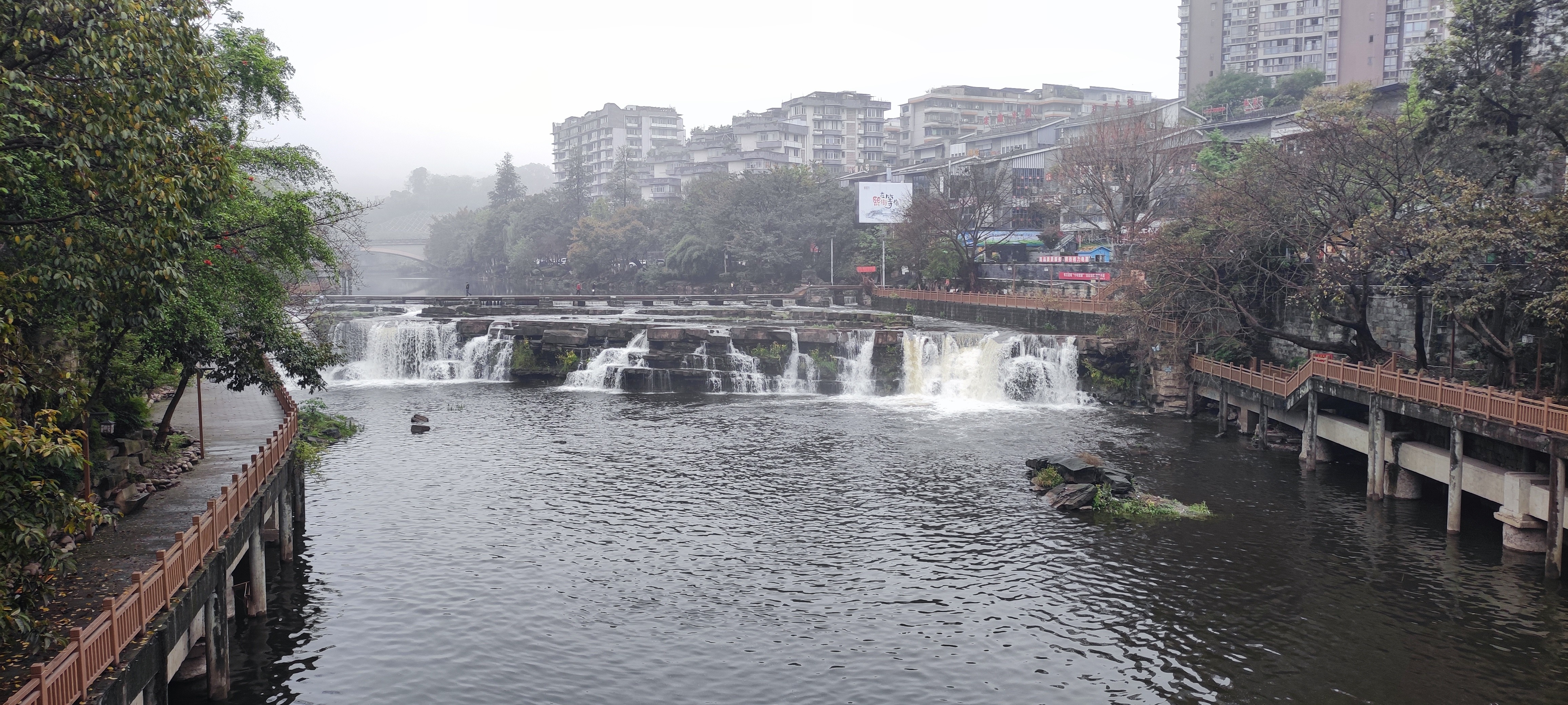 注:贡井平桥瀑布,是国内少见的城中瀑布,瀑布上游是旭水河的八里秦淮。由于冬季雨水小、少,导致河床干涸,瀑布断流,除一小股瀑布外,只见瀑布处岩石突兀。