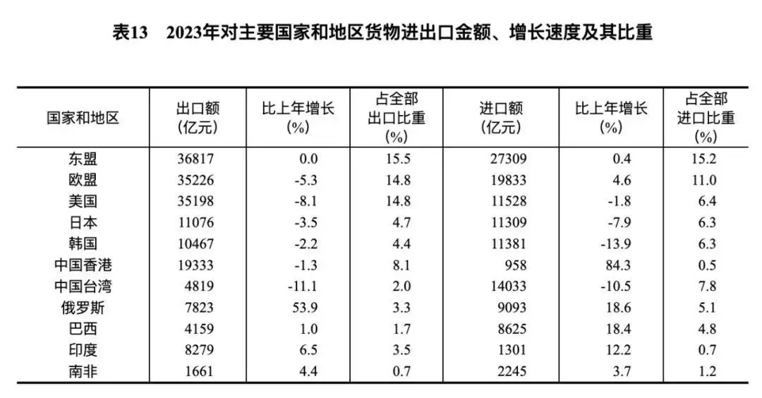 2023年对主要国家和地区货物进出口金额、增长速度及其比重/来源:国家统计局