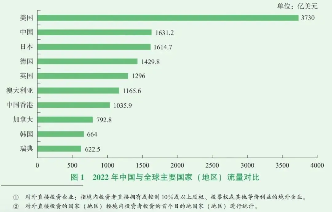 2022年中国与全球主要国家(地区)流量对比/图源:2022年度中国对外直接投资统计公报
