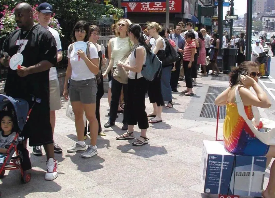 2004年7月1日,在与海尔美国总部大楼仅隔三个街区的曼哈顿广场,有大批美国消费者排起了长队等候购买海尔空调,最终7000台海尔空调在7小时内销售一空/图源:新华社