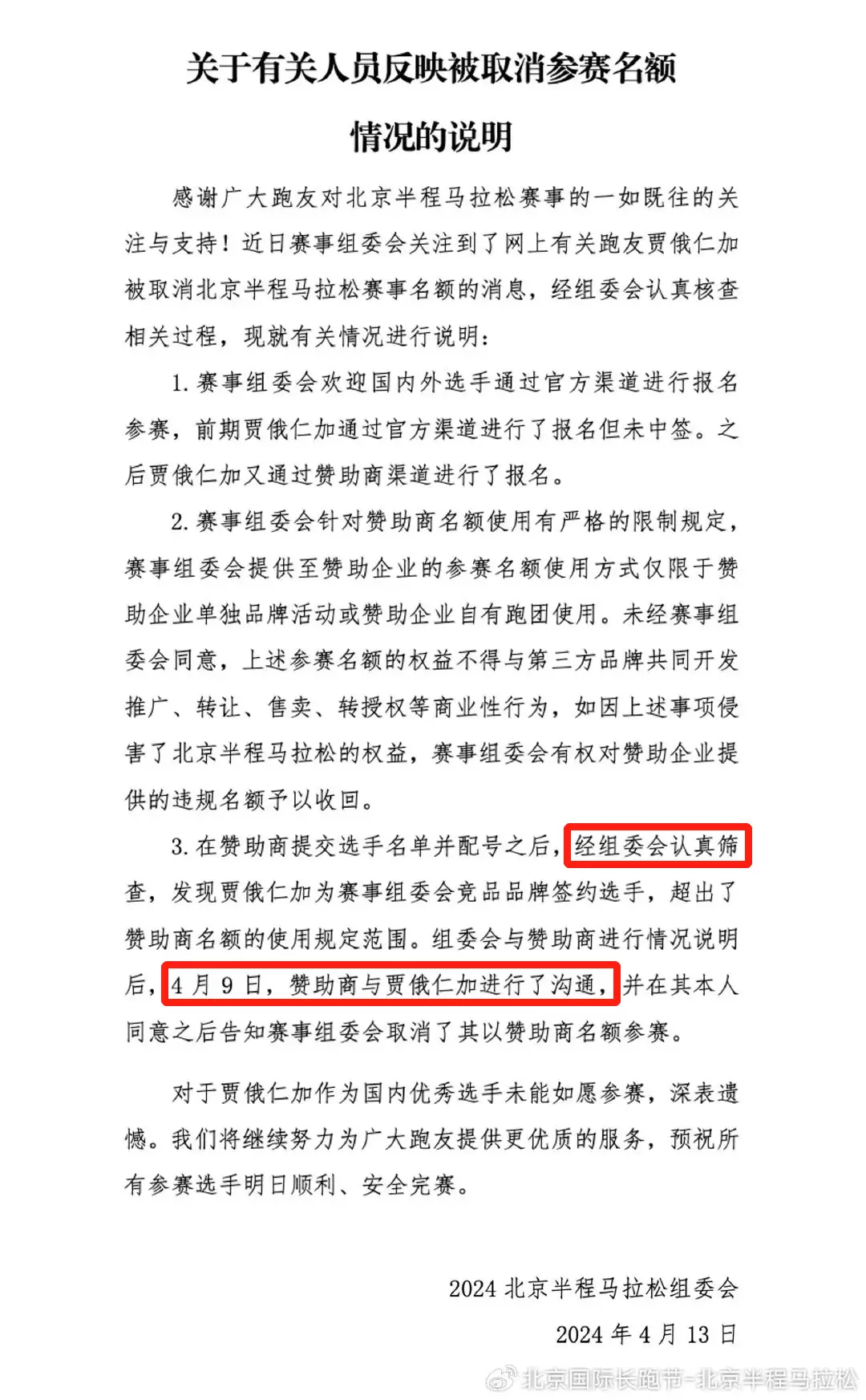 公告还说,赞助商已经在4月9日已经和贾俄仁加进行了沟通,取得对方本人的同意后才通知组委会取消了资格。
