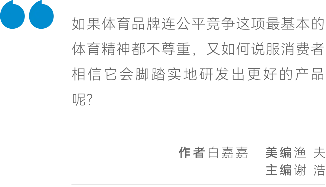 从企业出发,如果体育品牌连体育精神都不尊重,又如何说服消费者相信它会脚踏实地研发出更好的产品呢?失去用户,或许也只是时间问题。