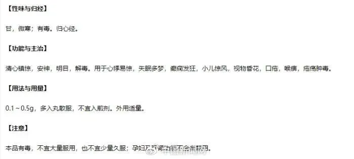 记者同时查询了《中华人民共和国药典》2020年版,在对朱砂的介绍中,提到了本品主含硫化汞,功能为清心镇惊,安神,明目,解毒。
