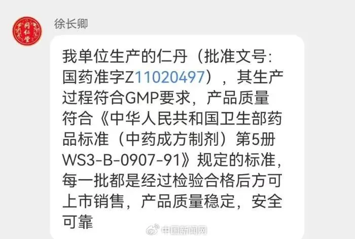 与上述证券部人士回复相似,多个同仁堂线上官方旗舰店客服也向记者表示,单位生产的仁丹(批准文号:国药准字Z11020497),其生产过程符合GMP要求,产品质量符合《中华人民共和国卫生部药品标准(中药成方制剂)第5册 WS3-B-0907-91》规定的标准,每一批都是经过检验合格后方可上市销售,产品质量稳定,安全可靠。