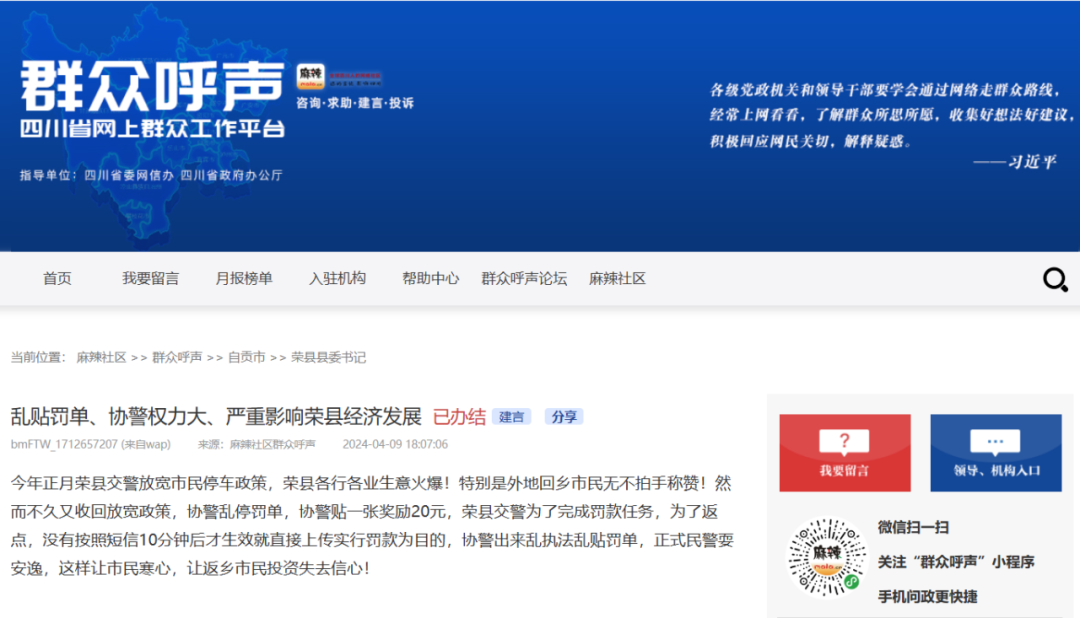 近日,网友在四川省网上群众工作平台