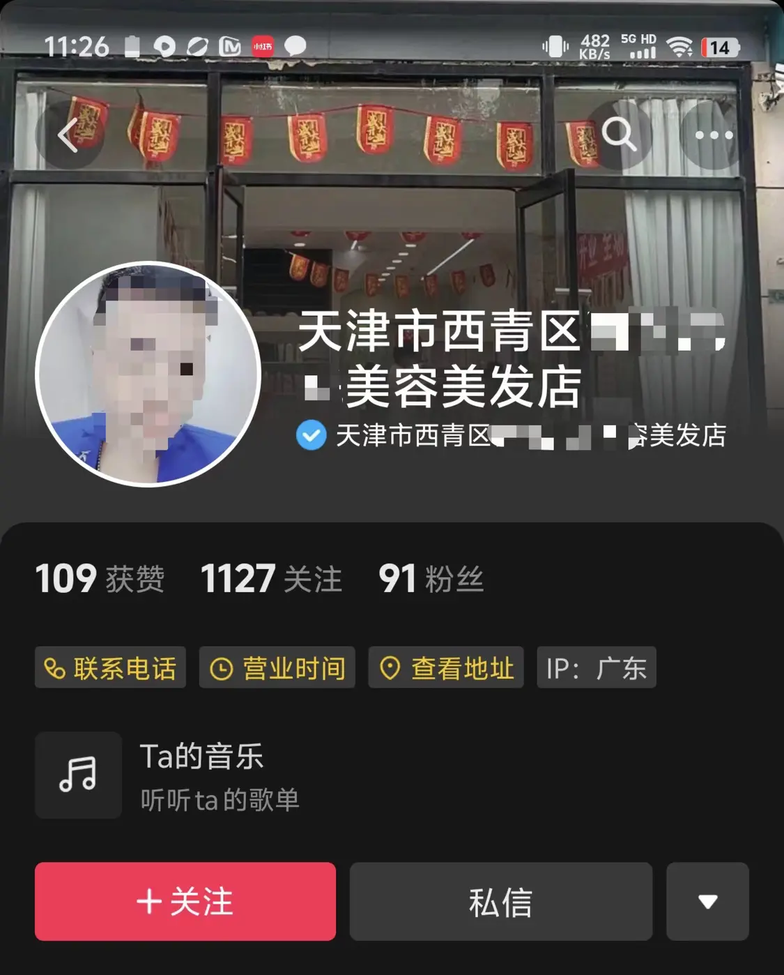 事后,小王在抖音上搜索到为他做发型的“明星造型师”张某,发现该理发师实际上是天津西青区一家理发店的发型师。账号图片显示,张某所在的理发店门面较小、环境简陋。
