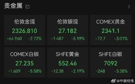 当地时间4月22日,伦敦现货黄金下跌2.72%,报2326.810美元/盎司,创近两年单日最大跌幅;COMEX黄金期货下跌3.01%,报2341.1美元/盎司;COMEX白银期货下跌5.58%,报27.235美元/盎司。