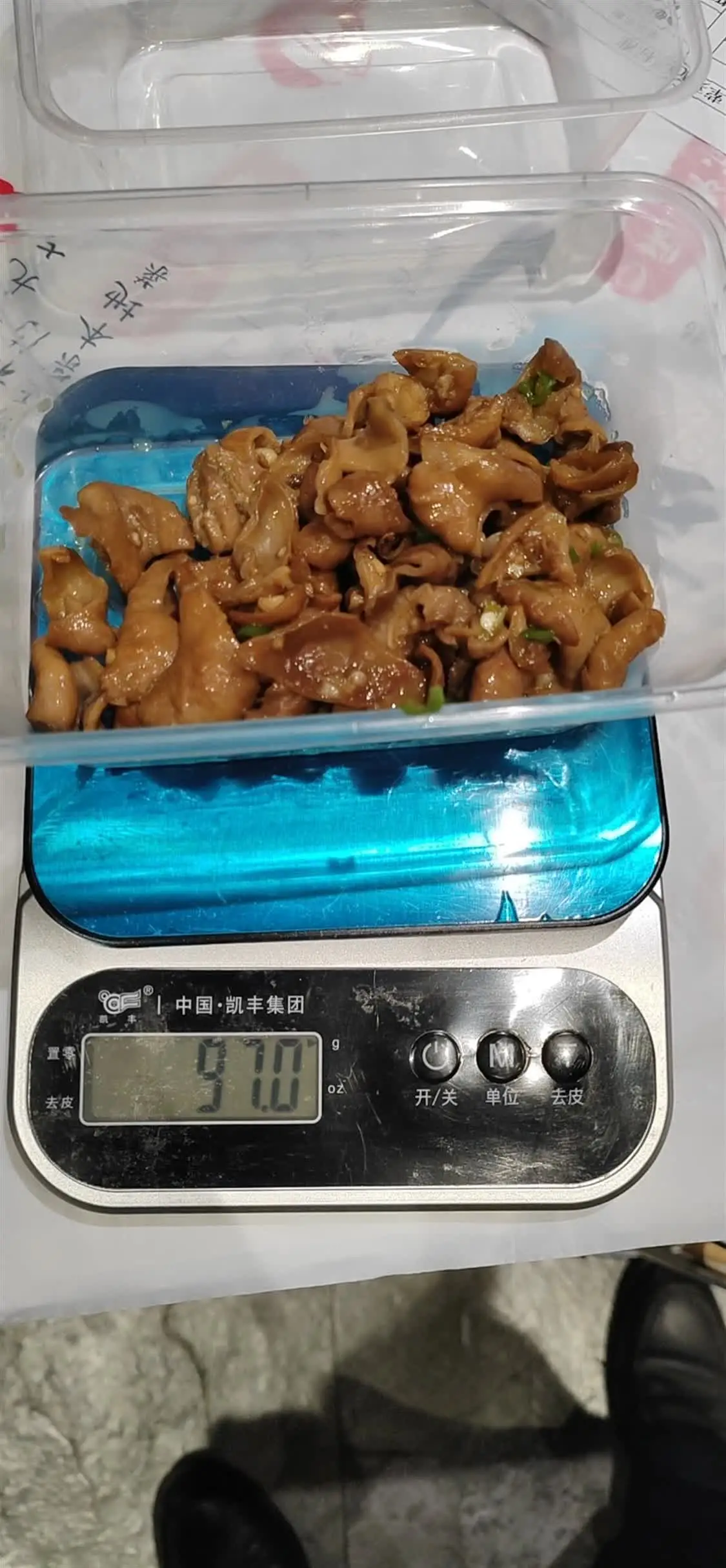 店内现炒一份青椒炒肥肠,显示肥肠97克(受访者供图)