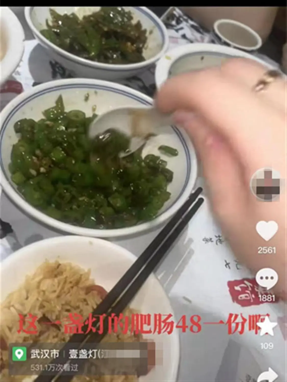 4月23日,一名网友发布短视频称,在武汉市江汉区“壹盏灯”餐厅花费48元点的一份青椒炒肥肠,肥肠只有五六块,其余全是青椒,其他菜的分量也很少,“严重踩雷,希望大家以后不要来壹盏灯吃饭。”24日下午,极目新闻记者分别联系了发布视频的网友和该门店店长。