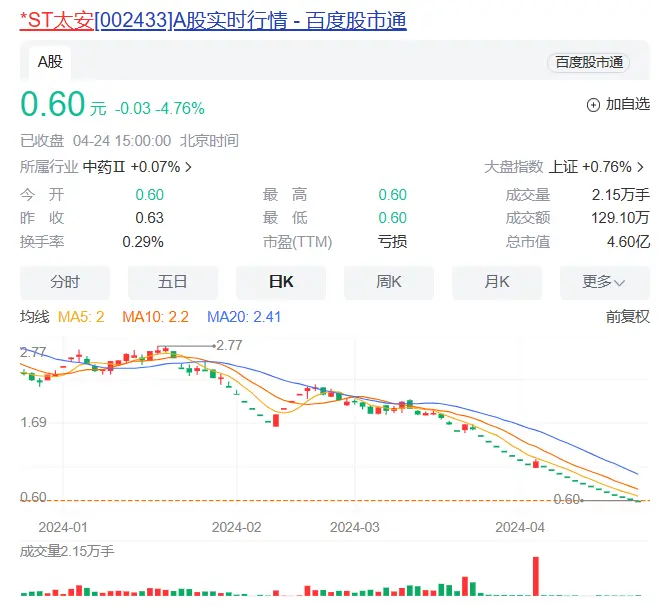 *ST**重整申请被终止,无疑加大了公司股票退市风险。4月8日至今,公司股票连续一字板跌停,跌至目前0.60元。