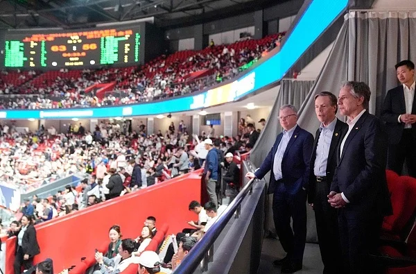 4月24日,布林肯一行观看CBA季后赛第二轮上海久事男篮主场迎战浙江稠州金租队的比赛。图自视觉中国