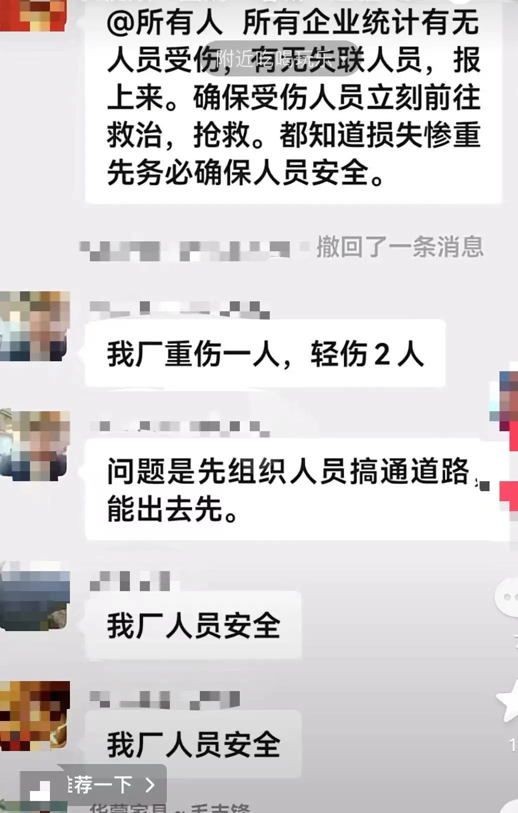另有当地网友发布截图显示,光明村村委正在向当地企业统计人员受伤情况。“所有企业统计有无人员受伤,有无失联人员,报上来。确保受伤人员立刻前往救治,抢救。都知道损失惨重先务必确保人员安全。”有多个厂家反映其厂人员安全,也有厂家反映其厂重伤1人,轻伤2人。