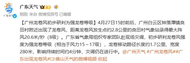 据广东省气象局27日晚发布广州市白云区钟落潭镇龙卷风情况说明称,初步研判龙卷风强度为3级,属强龙卷,龙卷影响距离约1公里,灾调仍在进行中。