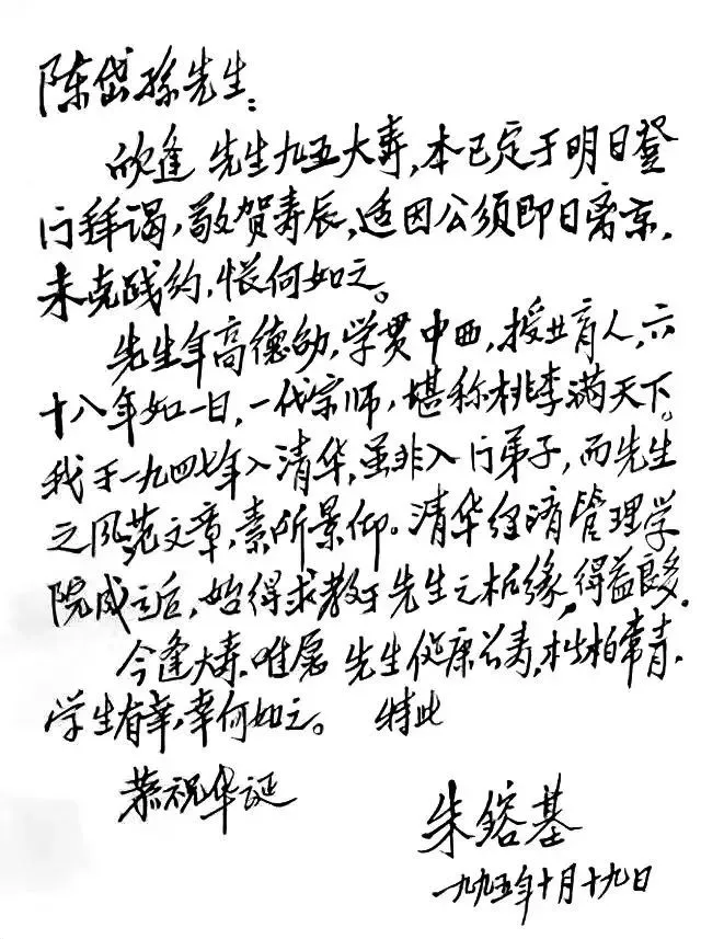 1995年陈岱孙95岁生日时朱镕基的贺信。