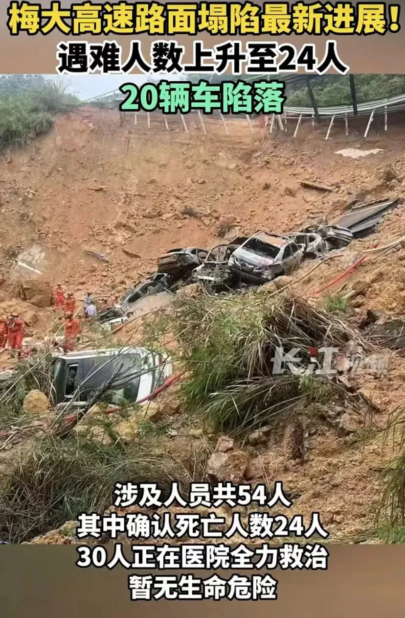 5月1日凌晨,广东梅州梅大高速公路发生路面塌方,18辆汽车跌落山坡,截至发稿前已造成24人死亡,30人受伤。