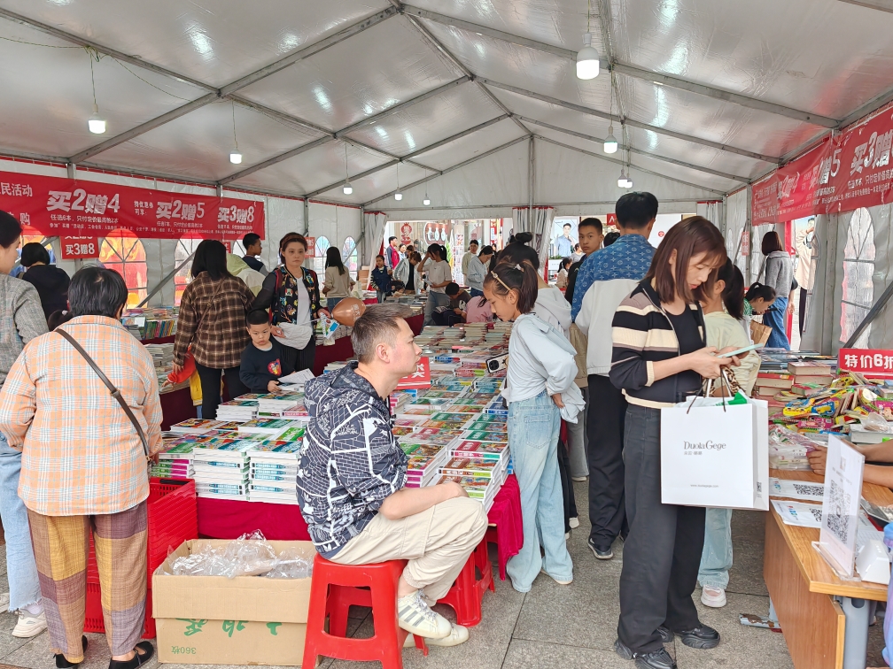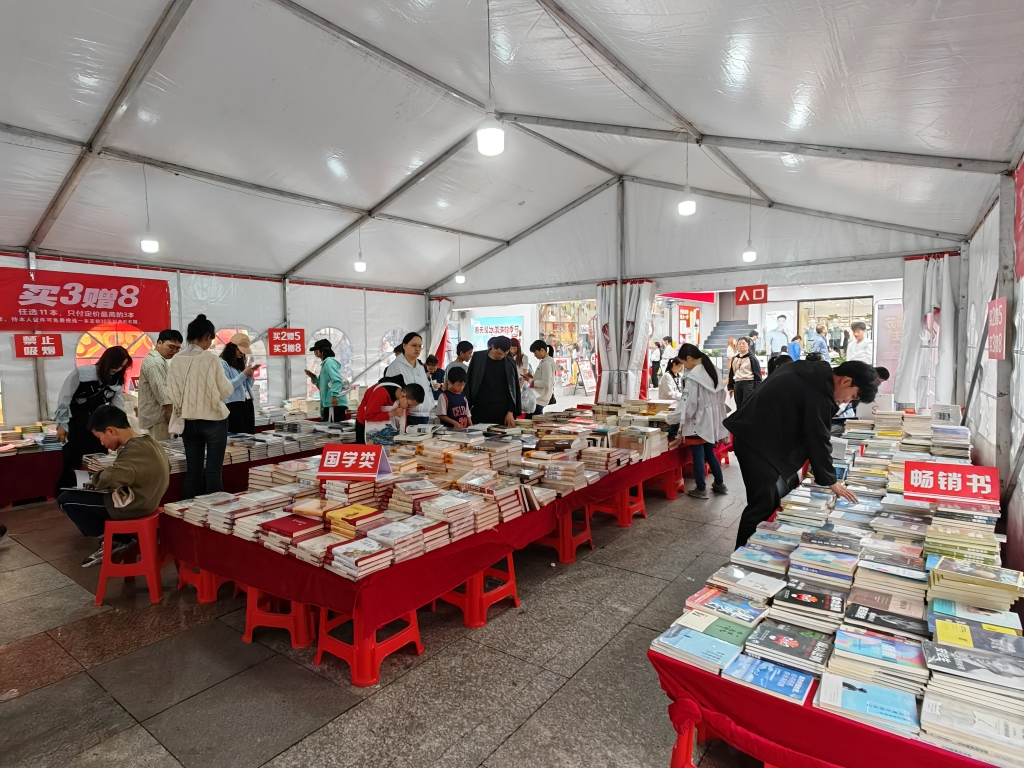 首先看到的是“读万卷书•行万里路”图书惠民活动,前来阅读、选购的年轻人不少。