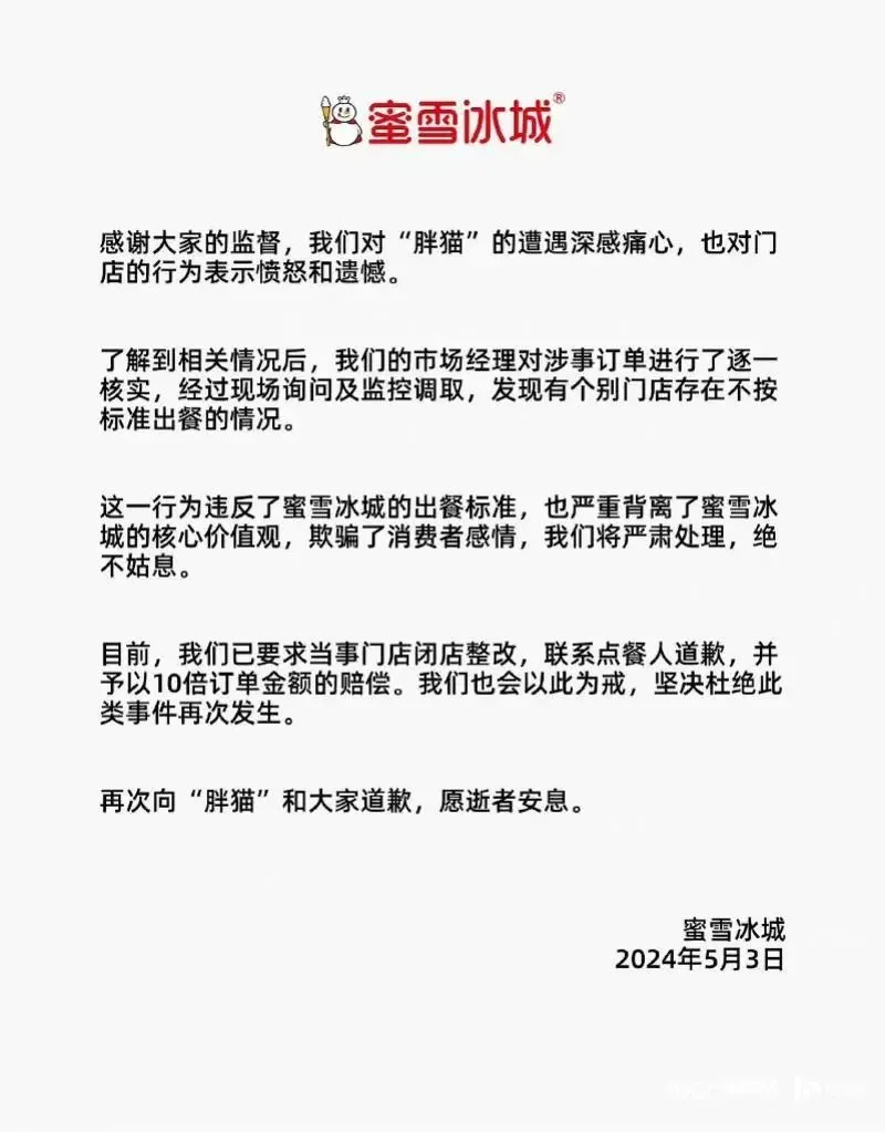 此举引发网友更大的愤慨。对此,5月3日,茶百道、华莱士、朱小小螺蛳粉等品牌方发表声明道歉,对相关订单给予退款、赔偿;重庆渝中市场监督管理局也表示接到多起投诉,将跟进此事。