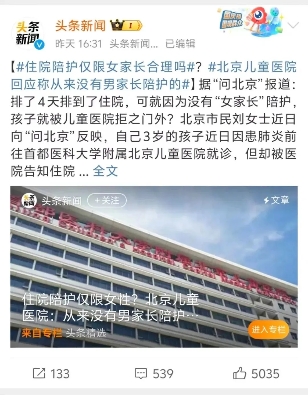 [1]问北京.《住院陪护仅限女性?北京儿童医院:从来没有男家长陪护的……》
